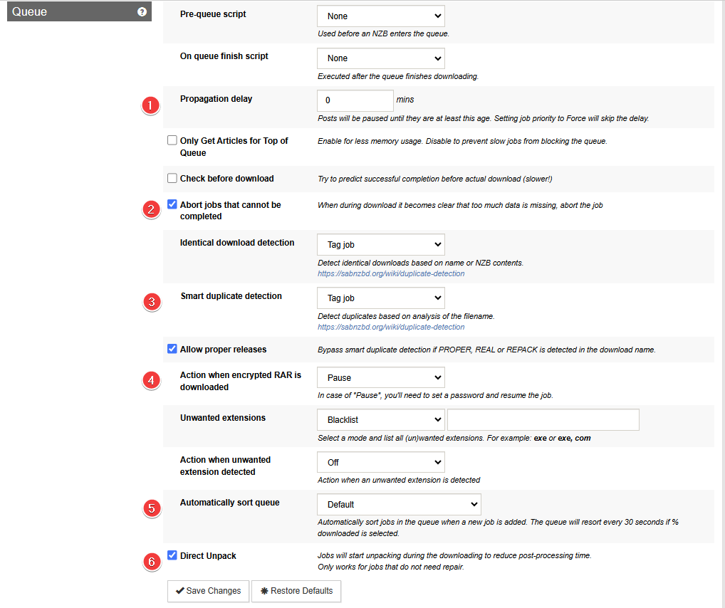 - Since we have the .nzb history folder, you can decide what you want to do here with duplicate downloads. Mine is set to Tag job, but Pause or Fail job may make sense too.