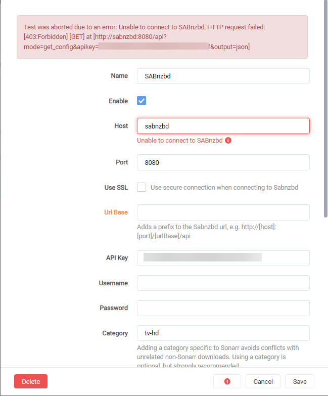 Unable to connect to SABnzbd